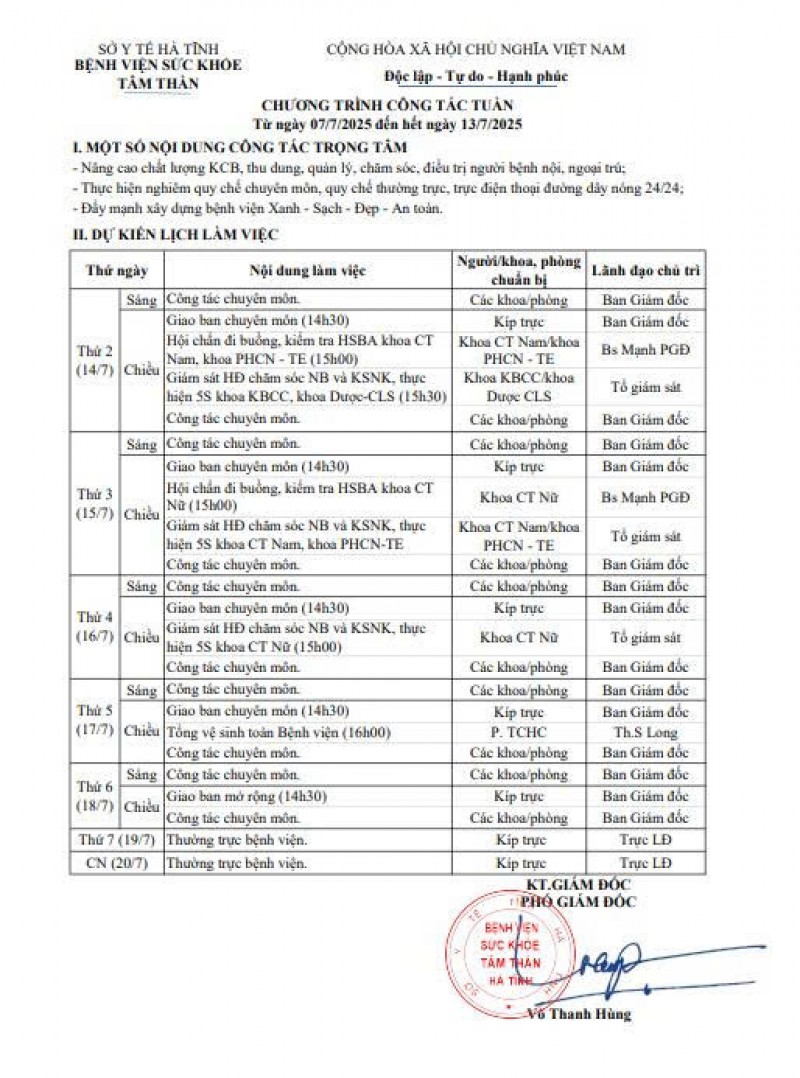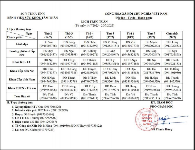 14/07/2025 08:07:22 Lịch trực, lịch công tác tuần 14/7/2025 - 20/7/2025 Bài viết liên quan Đại hội Công đoàn cơ sở Bệnh viện Sức khỏe tâm thần Hà Tĩnh nhiệm kỳ 2025 - 2030 Chào cờ, sinh hoạt chi bộ tháng 11 năm 2025 Những người gieo hy vọng! Đề nghị cung cấp báo giá máy điều hòa không khí Bệnh viện Sức khỏe tâm thần Hà Tĩnh tưng bừng tổ chức giải bóng chuyền đệm nam, nữ, kéo co, chào mừng ngày 20/10 Đề nghị cung cấp báo giá máy photocopy Quan tâm chăm sóc sức khỏe tâm thần trong thảm họa và tình huống khẩn cấp Đề nghị cung cấp báo giá may trang phục cho nhân viên Y tế FDA CẢNH BÁO VỀ PHẢN ỨNG THUỐC HIẾM GẶP NHƯNG NGUY HIỂM CỦA CÁC THUỐC CHỐNG ĐỘNG KINH LEVITIRACETAM VÀ CLOBAZAM Chào cờ, sinh hoạt chi bộ tháng 10 năm 2025 THÔNG BÁO Tết trồng cây nhớ ơn Bác Hồ tại Bệnh viện Sức khoẻ tâm thần Hà Tĩnh Dự toán ngân sách năm 2025 Hướng về người bệnh Chào cờ, sinh hoạt chi bộ tháng 01 năm 2025 Giá dịch vụ khám bệnh, chữa bệnh tại bệnh viện theo Nghị quyết 217/NQHĐND Họp Hội đồng người bệnh tại Bệnh viện Sức khoẻ tâm thần Hà Tĩnh Luật Lưu trữ 2024 Đại hội Chi bộ Bệnh viện Sức khoẻ tâm thần Hà Tĩnh khoá V, nhiệm kỳ 2024-2027 BẢN ĐỒ TỈNH HÀ TĨNH THỐNG KÊ TRUY CẬP Tổng truy cập : 578145 Hôm qua : 674 Đang online : 281