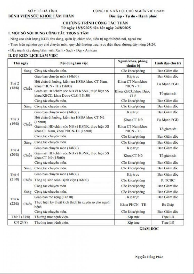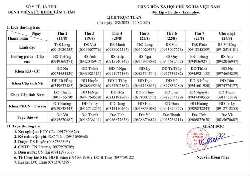 18/08/2025 08:17:54 Lịch trực, lịch công tác tuần từ ngày18/8/2025 - 24/8/2025 Bài viết liên quan Đại hội Công đoàn cơ sở Bệnh viện Sức khỏe tâm thần Hà Tĩnh nhiệm kỳ 2025 - 2030 Chào cờ, sinh hoạt chi bộ tháng 11 năm 2025 Những người gieo hy vọng! Đề nghị cung cấp báo giá máy điều hòa không khí Bệnh viện Sức khỏe tâm thần Hà Tĩnh tưng bừng tổ chức giải bóng chuyền đệm nam, nữ, kéo co, chào mừng ngày 20/10 Đề nghị cung cấp báo giá máy photocopy Quan tâm chăm sóc sức khỏe tâm thần trong thảm họa và tình huống khẩn cấp Đề nghị cung cấp báo giá may trang phục cho nhân viên Y tế FDA CẢNH BÁO VỀ PHẢN ỨNG THUỐC HIẾM GẶP NHƯNG NGUY HIỂM CỦA CÁC THUỐC CHỐNG ĐỘNG KINH LEVITIRACETAM VÀ CLOBAZAM Chào cờ, sinh hoạt chi bộ tháng 10 năm 2025 THÔNG BÁO Tết trồng cây nhớ ơn Bác Hồ tại Bệnh viện Sức khoẻ tâm thần Hà Tĩnh Dự toán ngân sách năm 2025 Hướng về người bệnh Chào cờ, sinh hoạt chi bộ tháng 01 năm 2025 Giá dịch vụ khám bệnh, chữa bệnh tại bệnh viện theo Nghị quyết 217/NQHĐND Họp Hội đồng người bệnh tại Bệnh viện Sức khoẻ tâm thần Hà Tĩnh Luật Lưu trữ 2024 Đại hội Chi bộ Bệnh viện Sức khoẻ tâm thần Hà Tĩnh khoá V, nhiệm kỳ 2024-2027 BẢN ĐỒ TỈNH HÀ TĨNH THỐNG KÊ TRUY CẬP Tổng truy cập : 578145 Hôm qua : 674 Đang online : 281