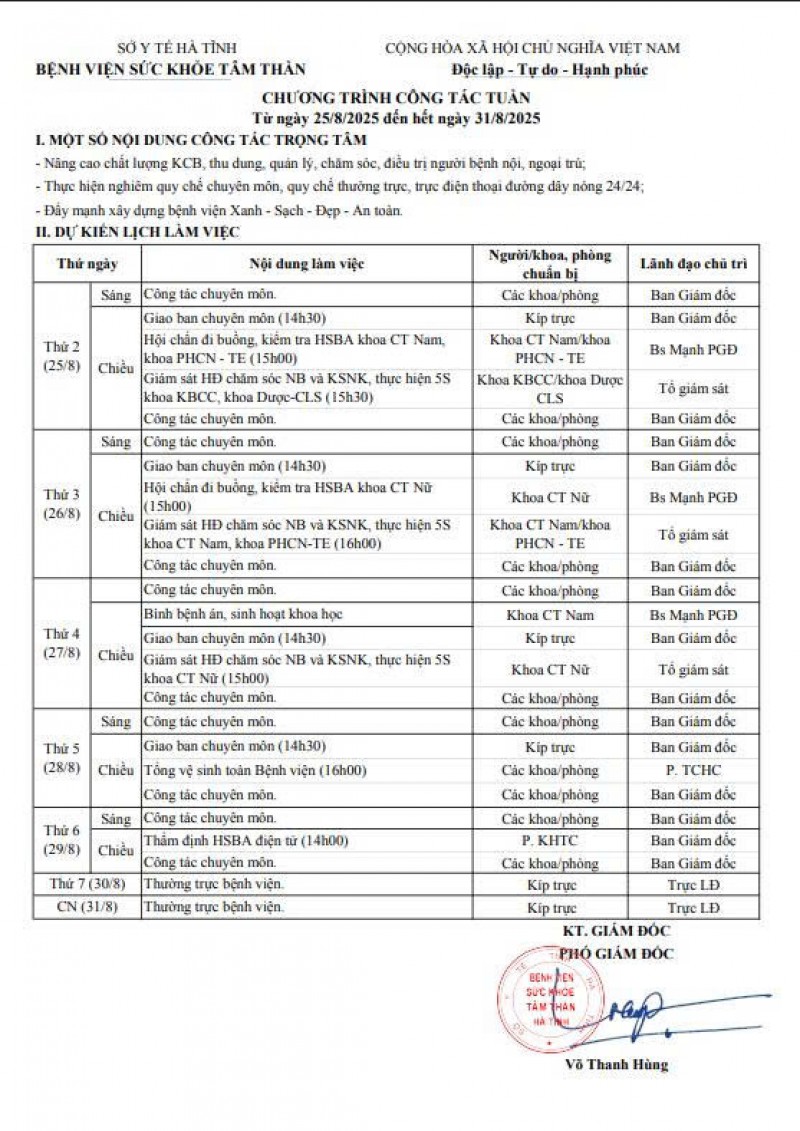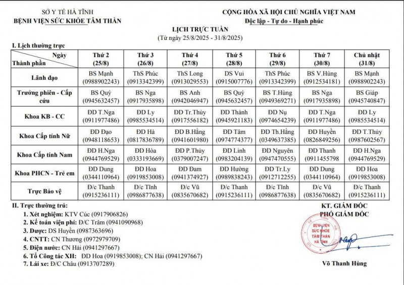 25/08/2025 08:20:25 Lịch trực, lịch công tác từ ngày 25/08/2025 - 31/08/2025 Bài viết liên quan Đại hội Công đoàn cơ sở Bệnh viện Sức khỏe tâm thần Hà Tĩnh nhiệm kỳ 2025 - 2030 Chào cờ, sinh hoạt chi bộ tháng 11 năm 2025 Những người gieo hy vọng! Đề nghị cung cấp báo giá máy điều hòa không khí Bệnh viện Sức khỏe tâm thần Hà Tĩnh tưng bừng tổ chức giải bóng chuyền đệm nam, nữ, kéo co, chào mừng ngày 20/10 Đề nghị cung cấp báo giá máy photocopy Quan tâm chăm sóc sức khỏe tâm thần trong thảm họa và tình huống khẩn cấp Đề nghị cung cấp báo giá may trang phục cho nhân viên Y tế FDA CẢNH BÁO VỀ PHẢN ỨNG THUỐC HIẾM GẶP NHƯNG NGUY HIỂM CỦA CÁC THUỐC CHỐNG ĐỘNG KINH LEVITIRACETAM VÀ CLOBAZAM Chào cờ, sinh hoạt chi bộ tháng 10 năm 2025 THÔNG BÁO Tết trồng cây nhớ ơn Bác Hồ tại Bệnh viện Sức khoẻ tâm thần Hà Tĩnh Dự toán ngân sách năm 2025 Hướng về người bệnh Chào cờ, sinh hoạt chi bộ tháng 01 năm 2025 Giá dịch vụ khám bệnh, chữa bệnh tại bệnh viện theo Nghị quyết 217/NQHĐND Họp Hội đồng người bệnh tại Bệnh viện Sức khoẻ tâm thần Hà Tĩnh Luật Lưu trữ 2024 Đại hội Chi bộ Bệnh viện Sức khoẻ tâm thần Hà Tĩnh khoá V, nhiệm kỳ 2024-2027 BẢN ĐỒ TỈNH HÀ TĨNH THỐNG KÊ TRUY CẬP Tổng truy cập : 578147 Hôm qua : 674 Đang online : 283