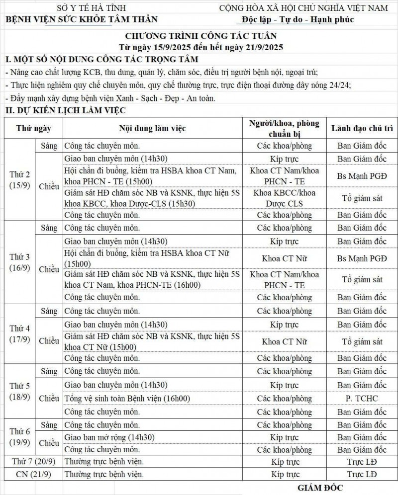 15/09/2025 08:27:45 Lịch trực, lịch công tác tuần từ 15/9/2025 - 21/9/2025 Bài viết liên quan Đại hội Công đoàn cơ sở Bệnh viện Sức khỏe tâm thần Hà Tĩnh nhiệm kỳ 2025 - 2030 Chào cờ, sinh hoạt chi bộ tháng 11 năm 2025 Những người gieo hy vọng! Đề nghị cung cấp báo giá máy điều hòa không khí Bệnh viện Sức khỏe tâm thần Hà Tĩnh tưng bừng tổ chức giải bóng chuyền đệm nam, nữ, kéo co, chào mừng ngày 20/10 Đề nghị cung cấp báo giá máy photocopy Quan tâm chăm sóc sức khỏe tâm thần trong thảm họa và tình huống khẩn cấp Đề nghị cung cấp báo giá may trang phục cho nhân viên Y tế FDA CẢNH BÁO VỀ PHẢN ỨNG THUỐC HIẾM GẶP NHƯNG NGUY HIỂM CỦA CÁC THUỐC CHỐNG ĐỘNG KINH LEVITIRACETAM VÀ CLOBAZAM Chào cờ, sinh hoạt chi bộ tháng 10 năm 2025 THÔNG BÁO Tết trồng cây nhớ ơn Bác Hồ tại Bệnh viện Sức khoẻ tâm thần Hà Tĩnh Dự toán ngân sách năm 2025 Hướng về người bệnh Chào cờ, sinh hoạt chi bộ tháng 01 năm 2025 Giá dịch vụ khám bệnh, chữa bệnh tại bệnh viện theo Nghị quyết 217/NQHĐND Họp Hội đồng người bệnh tại Bệnh viện Sức khoẻ tâm thần Hà Tĩnh Luật Lưu trữ 2024 Đại hội Chi bộ Bệnh viện Sức khoẻ tâm thần Hà Tĩnh khoá V, nhiệm kỳ 2024-2027 BẢN ĐỒ TỈNH HÀ TĨNH THỐNG KÊ TRUY CẬP Tổng truy cập : 578127 Hôm qua : 674 Đang online : 272