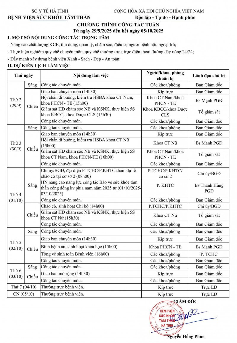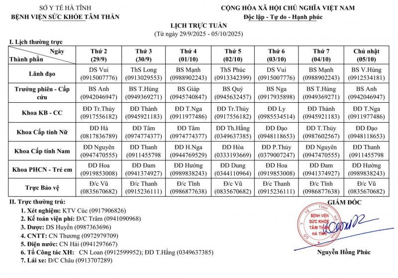 29/09/2025 08:32:14 Lịch trực, lịch công tác tuần từ 29/9/2025 - 05/10/2025 Bài viết liên quan Đại hội Công đoàn cơ sở Bệnh viện Sức khỏe tâm thần Hà Tĩnh nhiệm kỳ 2025 - 2030 Chào cờ, sinh hoạt chi bộ tháng 11 năm 2025 Những người gieo hy vọng! Đề nghị cung cấp báo giá máy điều hòa không khí Bệnh viện Sức khỏe tâm thần Hà Tĩnh tưng bừng tổ chức giải bóng chuyền đệm nam, nữ, kéo co, chào mừng ngày 20/10 Đề nghị cung cấp báo giá máy photocopy Quan tâm chăm sóc sức khỏe tâm thần trong thảm họa và tình huống khẩn cấp Đề nghị cung cấp báo giá may trang phục cho nhân viên Y tế FDA CẢNH BÁO VỀ PHẢN ỨNG THUỐC HIẾM GẶP NHƯNG NGUY HIỂM CỦA CÁC THUỐC CHỐNG ĐỘNG KINH LEVITIRACETAM VÀ CLOBAZAM Chào cờ, sinh hoạt chi bộ tháng 10 năm 2025 THÔNG BÁO Tết trồng cây nhớ ơn Bác Hồ tại Bệnh viện Sức khoẻ tâm thần Hà Tĩnh Dự toán ngân sách năm 2025 Hướng về người bệnh Chào cờ, sinh hoạt chi bộ tháng 01 năm 2025 Giá dịch vụ khám bệnh, chữa bệnh tại bệnh viện theo Nghị quyết 217/NQHĐND Họp Hội đồng người bệnh tại Bệnh viện Sức khoẻ tâm thần Hà Tĩnh Luật Lưu trữ 2024 Đại hội Chi bộ Bệnh viện Sức khoẻ tâm thần Hà Tĩnh khoá V, nhiệm kỳ 2024-2027 BẢN ĐỒ TỈNH HÀ TĨNH THỐNG KÊ TRUY CẬP Tổng truy cập : 578127 Hôm qua : 674 Đang online : 271