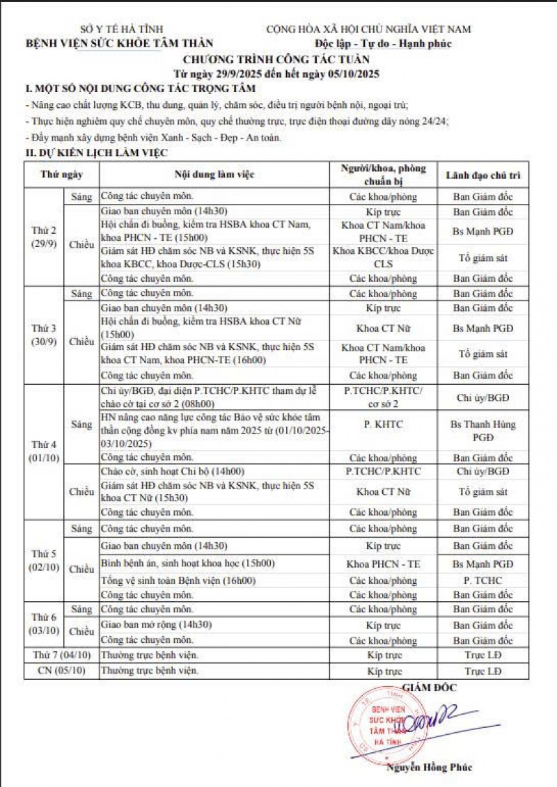 29/09/2025 16:28:57 Lịch trực, Lịch công tác tuần từ 29/9/2025 - 05/10/2025 Bài viết liên quan Thành Sen Biển Thạch Hải Thành tựu phát triển kinh tế xã hội và nhân quyền tỉnh Hà Tĩnh Tuyên truyền kết quả Đại hội Đảng bộ tỉnh Lịch trực, lịch công tác tuần từ ngày 19/01/2026 - 25/01/2026 Các hoạt động chào mừng tháng thanh niên năm 2026 tại Bệnh viện Sức khỏe tâm thần Hà Tĩnh Bệnh viện Sức khỏe tâm thần Hà Tĩnh: “Tết trồng cây đời đời nhớ ơn Bác Hồ” Xuân Bính ngọ 2026 Bác sỹ về hưu vẫn ở lại với những mãnh đời bất hạnh Đoàn công tác Tỉnh ủy, HĐND, UBND, Ủy ban MTTQ tỉnh chúc mừng Bệnh viện Sức khỏe tâm thần Hà Tĩnh nhân ngày Thầy thuốc Việt Nam Lịch trực tuần, lịch công tác tuần Tết Nguyên Đán, Lịch Đội CCCĐ, Lịch trực tuần sau Tết (Từ ngày 16/02 - 01/03/2026) THÔNG BÁO Mất Ngủ ở Người Trẻ: Thách Thức Sức Khỏe Tâm Lý và Giải Pháp Tết trồng cây nhớ ơn Bác Hồ tại Bệnh viện Sức khoẻ tâm thần Hà Tĩnh Dự toán ngân sách năm 2025 Hướng về người bệnh Chào cờ, sinh hoạt chi bộ tháng 01 năm 2025 Giá dịch vụ khám bệnh, chữa bệnh tại bệnh viện theo Nghị quyết 217/NQHĐND Họp Hội đồng người bệnh tại Bệnh viện Sức khoẻ tâm thần Hà Tĩnh Luật Lưu trữ 2024 BẢN ĐỒ TỈNH HÀ TĨNH THỐNG KÊ TRUY CẬP Tổng truy cập : 664560 Hôm qua : 695 Đang online : 2832