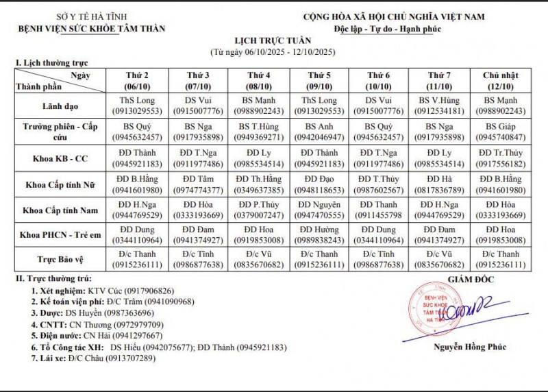 06/10/2025 16:31:09 Lịch trực tuần từ ngày 06/10/2025 - 12/10/2025 Bài viết liên quan Thành Sen Biển Thạch Hải Thành tựu phát triển kinh tế xã hội và nhân quyền tỉnh Hà Tĩnh Tuyên truyền kết quả Đại hội Đảng bộ tỉnh Lịch trực, lịch công tác tuần từ ngày 19/01/2026 - 25/01/2026 Các hoạt động chào mừng tháng thanh niên năm 2026 tại Bệnh viện Sức khỏe tâm thần Hà Tĩnh Bệnh viện Sức khỏe tâm thần Hà Tĩnh: “Tết trồng cây đời đời nhớ ơn Bác Hồ” Xuân Bính ngọ 2026 Bác sỹ về hưu vẫn ở lại với những mãnh đời bất hạnh Đoàn công tác Tỉnh ủy, HĐND, UBND, Ủy ban MTTQ tỉnh chúc mừng Bệnh viện Sức khỏe tâm thần Hà Tĩnh nhân ngày Thầy thuốc Việt Nam Lịch trực tuần, lịch công tác tuần Tết Nguyên Đán, Lịch Đội CCCĐ, Lịch trực tuần sau Tết (Từ ngày 16/02 - 01/03/2026) THÔNG BÁO Mất Ngủ ở Người Trẻ: Thách Thức Sức Khỏe Tâm Lý và Giải Pháp Tết trồng cây nhớ ơn Bác Hồ tại Bệnh viện Sức khoẻ tâm thần Hà Tĩnh Dự toán ngân sách năm 2025 Hướng về người bệnh Chào cờ, sinh hoạt chi bộ tháng 01 năm 2025 Giá dịch vụ khám bệnh, chữa bệnh tại bệnh viện theo Nghị quyết 217/NQHĐND Họp Hội đồng người bệnh tại Bệnh viện Sức khoẻ tâm thần Hà Tĩnh Luật Lưu trữ 2024 BẢN ĐỒ TỈNH HÀ TĨNH THỐNG KÊ TRUY CẬP Tổng truy cập : 664537 Hôm qua : 695 Đang online : 2819