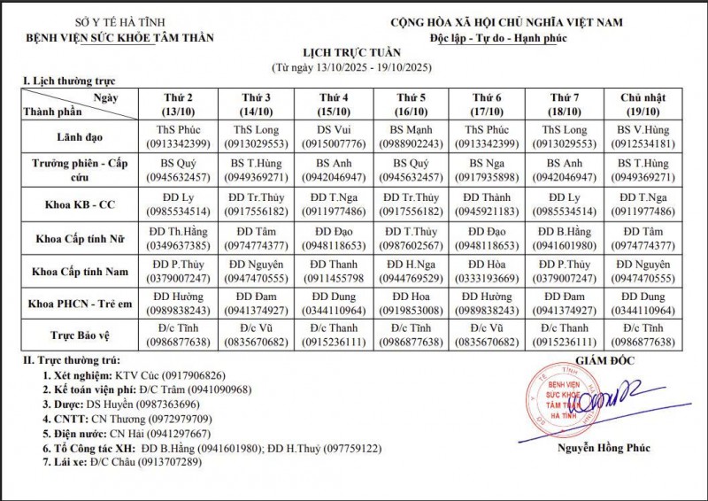 13/10/2025 15:23:33 Lịch trực tuần từ ngày 13/10/2025 - 19/10/2025 Bài viết liên quan Thành Sen Biển Thạch Hải Thành tựu phát triển kinh tế xã hội và nhân quyền tỉnh Hà Tĩnh Tuyên truyền kết quả Đại hội Đảng bộ tỉnh Lịch trực, lịch công tác tuần từ ngày 19/01/2026 - 25/01/2026 Các hoạt động chào mừng tháng thanh niên năm 2026 tại Bệnh viện Sức khỏe tâm thần Hà Tĩnh Bệnh viện Sức khỏe tâm thần Hà Tĩnh: “Tết trồng cây đời đời nhớ ơn Bác Hồ” Xuân Bính ngọ 2026 Bác sỹ về hưu vẫn ở lại với những mãnh đời bất hạnh Đoàn công tác Tỉnh ủy, HĐND, UBND, Ủy ban MTTQ tỉnh chúc mừng Bệnh viện Sức khỏe tâm thần Hà Tĩnh nhân ngày Thầy thuốc Việt Nam Lịch trực tuần, lịch công tác tuần Tết Nguyên Đán, Lịch Đội CCCĐ, Lịch trực tuần sau Tết (Từ ngày 16/02 - 01/03/2026) THÔNG BÁO Mất Ngủ ở Người Trẻ: Thách Thức Sức Khỏe Tâm Lý và Giải Pháp Tết trồng cây nhớ ơn Bác Hồ tại Bệnh viện Sức khoẻ tâm thần Hà Tĩnh Dự toán ngân sách năm 2025 Hướng về người bệnh Chào cờ, sinh hoạt chi bộ tháng 01 năm 2025 Giá dịch vụ khám bệnh, chữa bệnh tại bệnh viện theo Nghị quyết 217/NQHĐND Họp Hội đồng người bệnh tại Bệnh viện Sức khoẻ tâm thần Hà Tĩnh Luật Lưu trữ 2024 BẢN ĐỒ TỈNH HÀ TĨNH THỐNG KÊ TRUY CẬP Tổng truy cập : 664552 Hôm qua : 695 Đang online : 2827