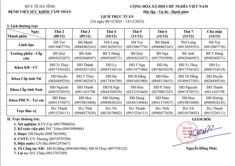 08/12/2025 15:37:25 Lịch trực tuần từ 08/12/2025 - 14/12/2025 Bài viết liên quan Thành Sen Biển Thạch Hải Thành tựu phát triển kinh tế xã hội và nhân quyền tỉnh Hà Tĩnh Tuyên truyền kết quả Đại hội Đảng bộ tỉnh Lịch trực, lịch công tác tuần từ ngày 19/01/2026 - 25/01/2026 Các hoạt động chào mừng tháng thanh niên năm 2026 tại Bệnh viện Sức khỏe tâm thần Hà Tĩnh Bệnh viện Sức khỏe tâm thần Hà Tĩnh: “Tết trồng cây đời đời nhớ ơn Bác Hồ” Xuân Bính ngọ 2026 Bác sỹ về hưu vẫn ở lại với những mãnh đời bất hạnh Đoàn công tác Tỉnh ủy, HĐND, UBND, Ủy ban MTTQ tỉnh chúc mừng Bệnh viện Sức khỏe tâm thần Hà Tĩnh nhân ngày Thầy thuốc Việt Nam Lịch trực tuần, lịch công tác tuần Tết Nguyên Đán, Lịch Đội CCCĐ, Lịch trực tuần sau Tết (Từ ngày 16/02 - 01/03/2026) THÔNG BÁO Mất Ngủ ở Người Trẻ: Thách Thức Sức Khỏe Tâm Lý và Giải Pháp Tết trồng cây nhớ ơn Bác Hồ tại Bệnh viện Sức khoẻ tâm thần Hà Tĩnh Dự toán ngân sách năm 2025 Hướng về người bệnh Chào cờ, sinh hoạt chi bộ tháng 01 năm 2025 Giá dịch vụ khám bệnh, chữa bệnh tại bệnh viện theo Nghị quyết 217/NQHĐND Họp Hội đồng người bệnh tại Bệnh viện Sức khoẻ tâm thần Hà Tĩnh Luật Lưu trữ 2024 BẢN ĐỒ TỈNH HÀ TĨNH THỐNG KÊ TRUY CẬP Tổng truy cập : 664537 Hôm qua : 695 Đang online : 2819