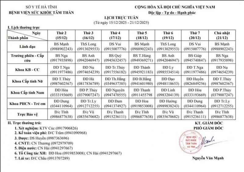 15/12/2025 15:38:53 Lịch trực tuần từ ngày 15/12/2025 - 21/12/2025 Bài viết liên quan Thành Sen Biển Thạch Hải Thành tựu phát triển kinh tế xã hội và nhân quyền tỉnh Hà Tĩnh Tuyên truyền kết quả Đại hội Đảng bộ tỉnh Lịch trực, lịch công tác tuần từ ngày 19/01/2026 - 25/01/2026 Các hoạt động chào mừng tháng thanh niên năm 2026 tại Bệnh viện Sức khỏe tâm thần Hà Tĩnh Bệnh viện Sức khỏe tâm thần Hà Tĩnh: “Tết trồng cây đời đời nhớ ơn Bác Hồ” Xuân Bính ngọ 2026 Bác sỹ về hưu vẫn ở lại với những mãnh đời bất hạnh Đoàn công tác Tỉnh ủy, HĐND, UBND, Ủy ban MTTQ tỉnh chúc mừng Bệnh viện Sức khỏe tâm thần Hà Tĩnh nhân ngày Thầy thuốc Việt Nam Lịch trực tuần, lịch công tác tuần Tết Nguyên Đán, Lịch Đội CCCĐ, Lịch trực tuần sau Tết (Từ ngày 16/02 - 01/03/2026) THÔNG BÁO Mất Ngủ ở Người Trẻ: Thách Thức Sức Khỏe Tâm Lý và Giải Pháp Tết trồng cây nhớ ơn Bác Hồ tại Bệnh viện Sức khoẻ tâm thần Hà Tĩnh Dự toán ngân sách năm 2025 Hướng về người bệnh Chào cờ, sinh hoạt chi bộ tháng 01 năm 2025 Giá dịch vụ khám bệnh, chữa bệnh tại bệnh viện theo Nghị quyết 217/NQHĐND Họp Hội đồng người bệnh tại Bệnh viện Sức khoẻ tâm thần Hà Tĩnh Luật Lưu trữ 2024 BẢN ĐỒ TỈNH HÀ TĨNH THỐNG KÊ TRUY CẬP Tổng truy cập : 664560 Hôm qua : 695 Đang online : 2832