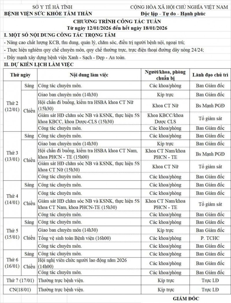 Lịch trực, lịch công tác tuần từ ngày 12/01/2026 - 18/01/2026