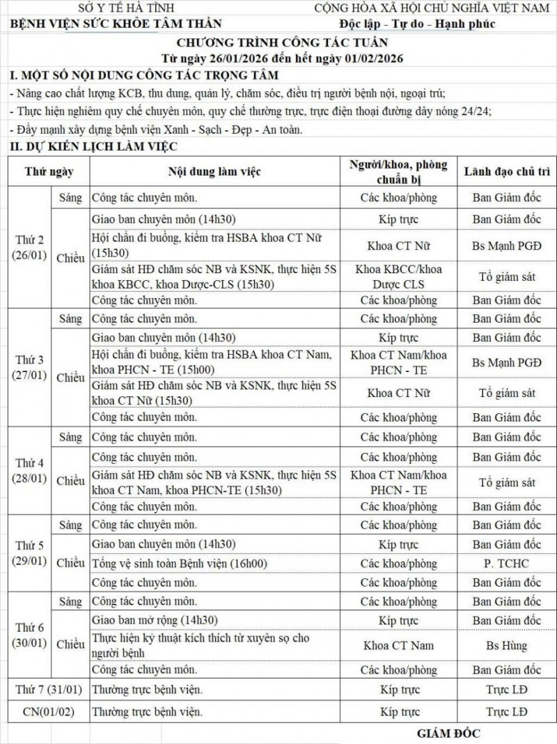 26/01/2026 15:49:37 lịch trực, lịch công tác tuần 26/01/2026 - 01/02/2026 Bài viết liên quan Thành Sen Biển Thạch Hải Thành tựu phát triển kinh tế xã hội và nhân quyền tỉnh Hà Tĩnh Tuyên truyền kết quả Đại hội Đảng bộ tỉnh Lịch trực, lịch công tác tuần từ ngày 19/01/2026 - 25/01/2026 Các hoạt động chào mừng tháng thanh niên năm 2026 tại Bệnh viện Sức khỏe tâm thần Hà Tĩnh Bệnh viện Sức khỏe tâm thần Hà Tĩnh: “Tết trồng cây đời đời nhớ ơn Bác Hồ” Xuân Bính ngọ 2026 Bác sỹ về hưu vẫn ở lại với những mãnh đời bất hạnh Đoàn công tác Tỉnh ủy, HĐND, UBND, Ủy ban MTTQ tỉnh chúc mừng Bệnh viện Sức khỏe tâm thần Hà Tĩnh nhân ngày Thầy thuốc Việt Nam Lịch trực tuần, lịch công tác tuần Tết Nguyên Đán, Lịch Đội CCCĐ, Lịch trực tuần sau Tết (Từ ngày 16/02 - 01/03/2026) THÔNG BÁO Mất Ngủ ở Người Trẻ: Thách Thức Sức Khỏe Tâm Lý và Giải Pháp Tết trồng cây nhớ ơn Bác Hồ tại Bệnh viện Sức khoẻ tâm thần Hà Tĩnh Dự toán ngân sách năm 2025 Hướng về người bệnh Chào cờ, sinh hoạt chi bộ tháng 01 năm 2025 Giá dịch vụ khám bệnh, chữa bệnh tại bệnh viện theo Nghị quyết 217/NQHĐND Họp Hội đồng người bệnh tại Bệnh viện Sức khoẻ tâm thần Hà Tĩnh Luật Lưu trữ 2024 BẢN ĐỒ TỈNH HÀ TĨNH THỐNG KÊ TRUY CẬP Tổng truy cập : 664481 Hôm qua : 695 Đang online : 2822